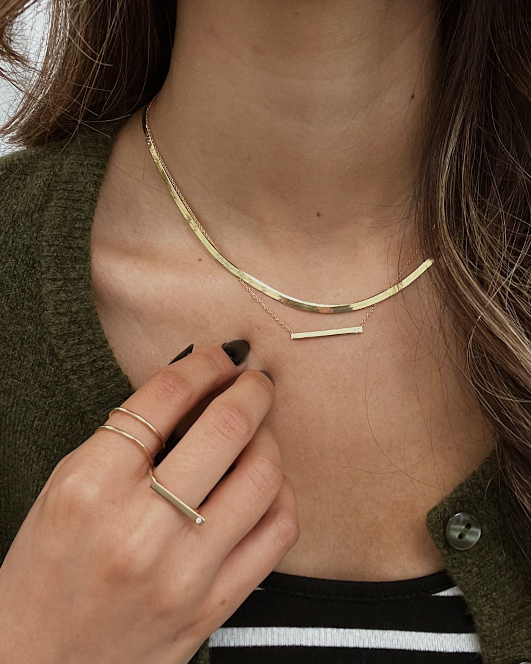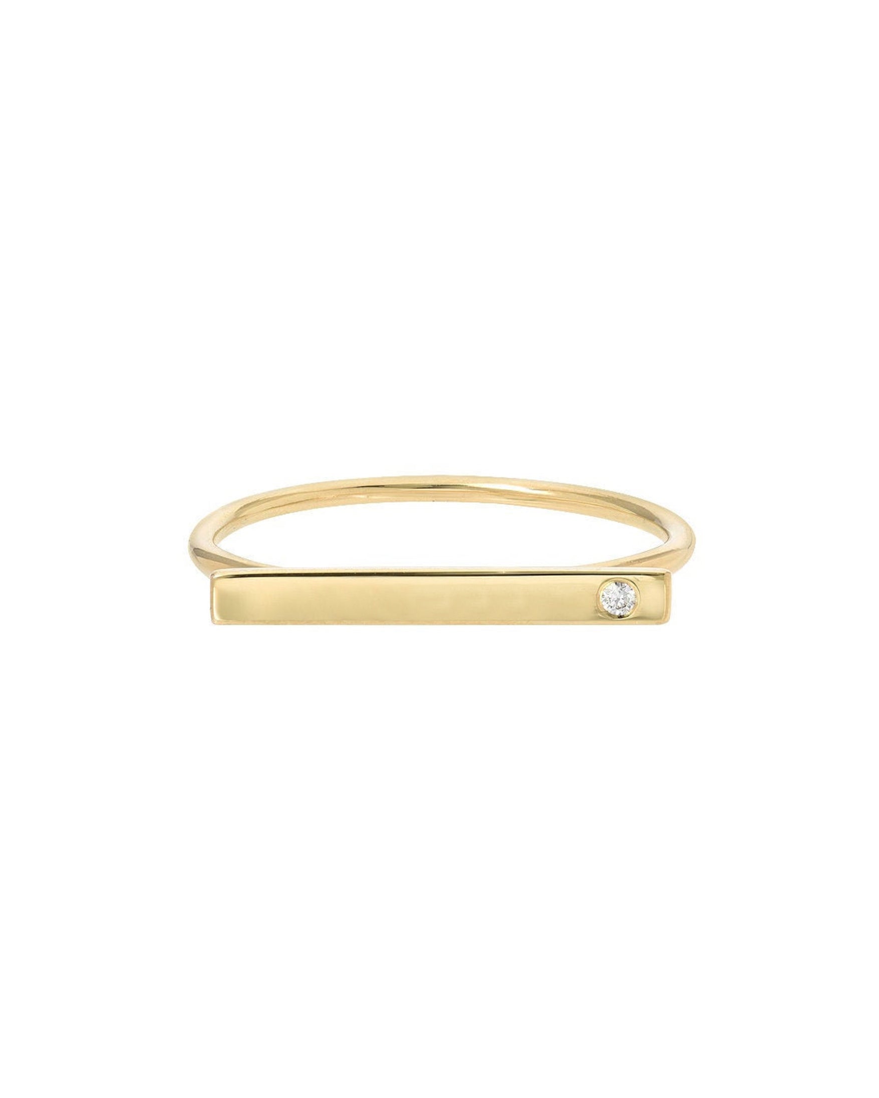 14k solid gold bar ring with tiny diamond to on a beautifully polished gold ring band, a classic and timeless ring, by itself or stacked.