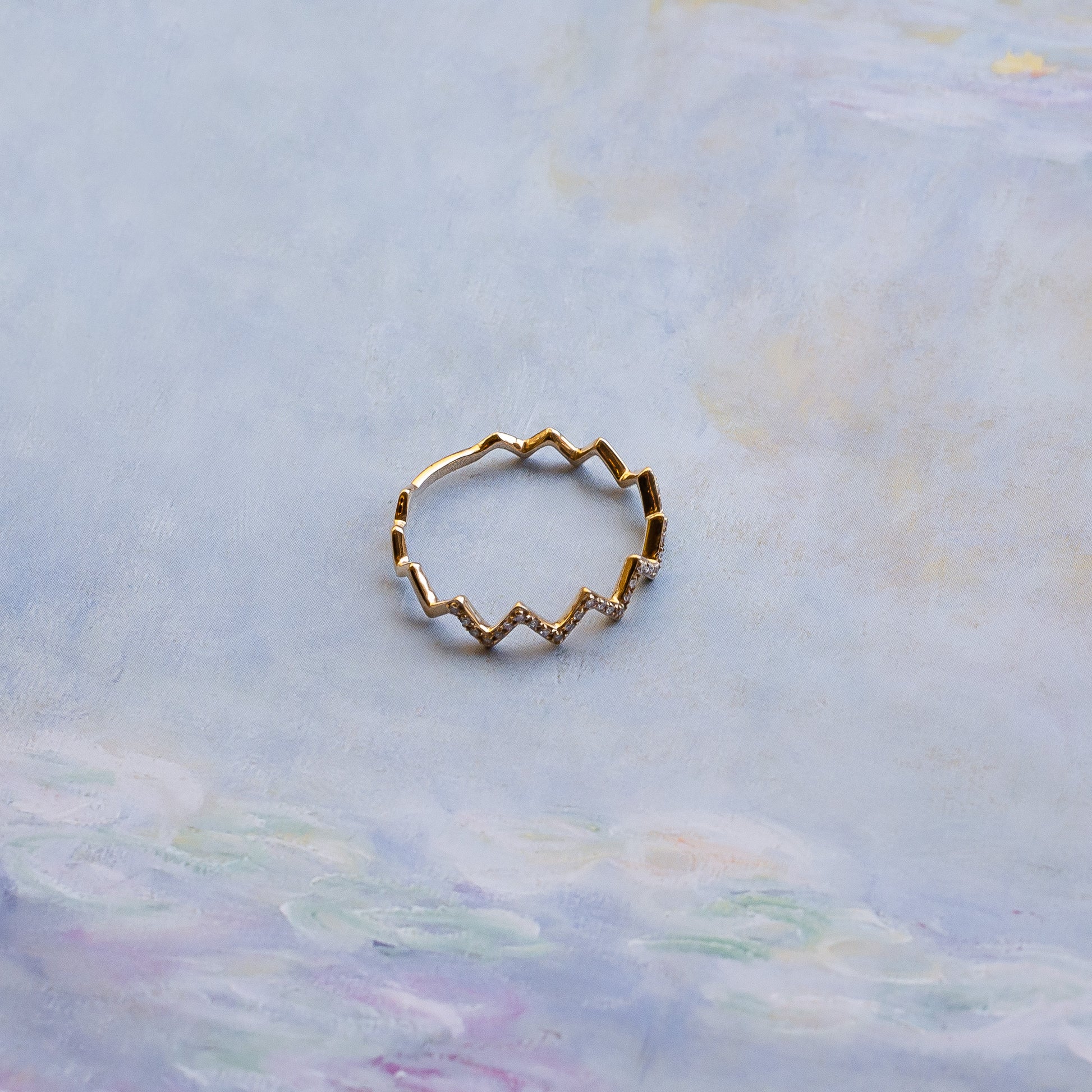 14k solid gold ring with a front segment of beautifully handcrafted dainty pave diamond zig zag pattern, the perfect ring by itself or stacked.