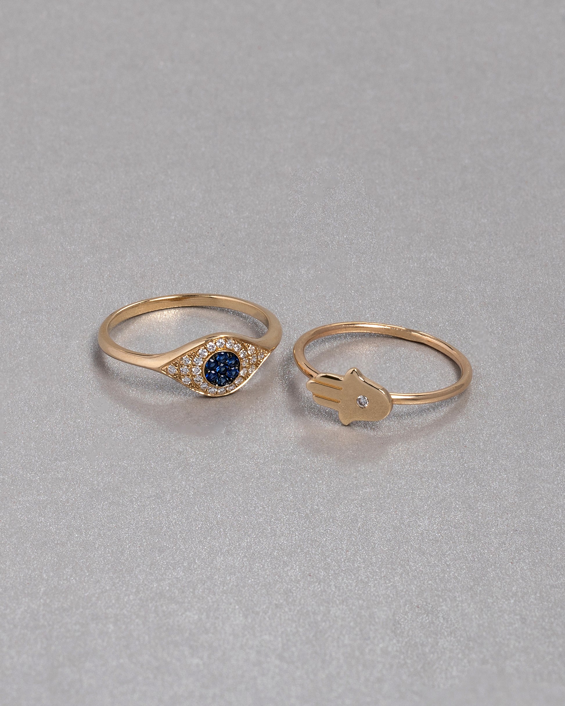 14k solid gold hamsa with center white diamond, sitting on a beautifully polished gold ring band, a classic and timeless ring, by itself or stacked