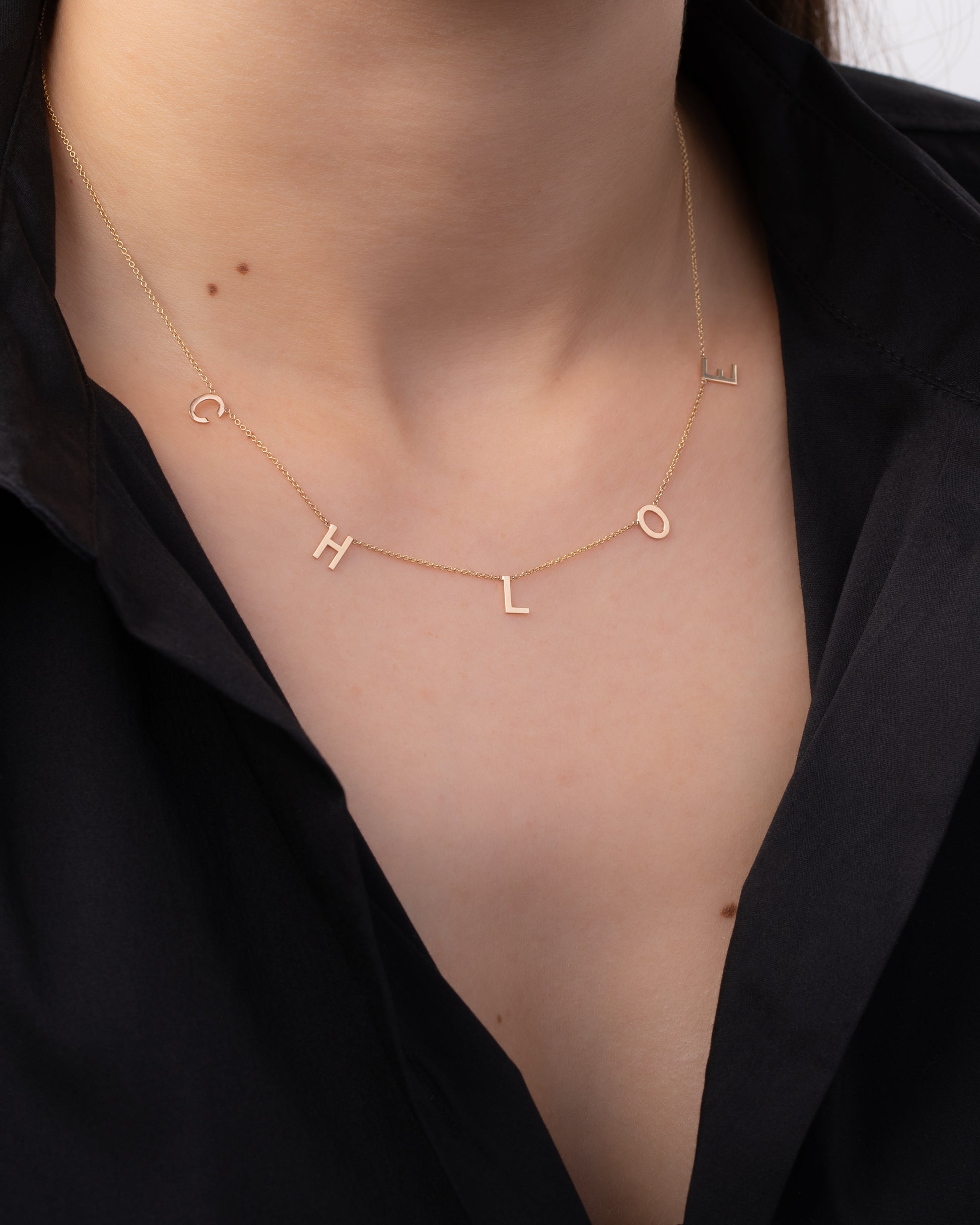 14k solid yellow gold multiple initial necklace, spaced evenly across necklace. Comes in the gold color of your choice, dainty and absolutely amazing! The perfect everyday necklace, by itself or layered.