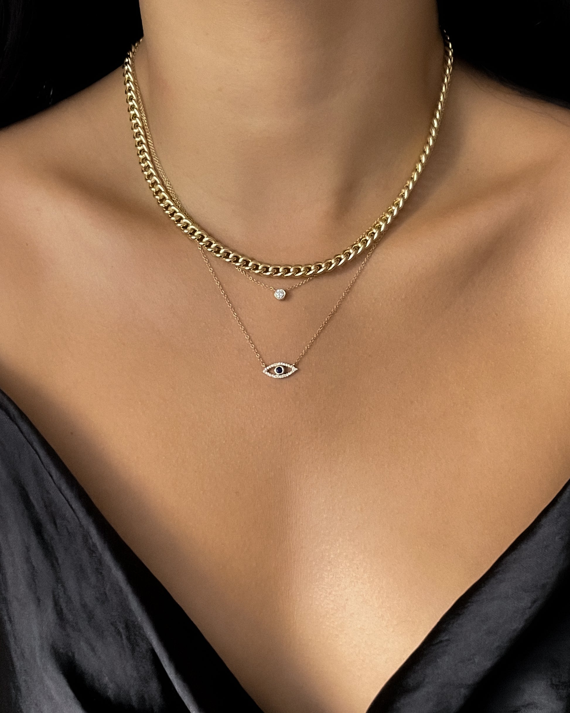 14k gold pave diamond evil eye with sapphire center, all hanging from a cable link necklace, it's perfect by itself or layered.